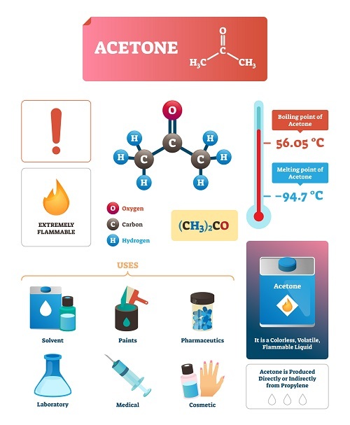 在實驗室中,可以透過加熱無水醋酸鈣來獲得丙酮。它自然存在於環境中,也可以在實驗室中製備。純丙酮包含其分子,當用酒精變性時,它可以分解成強力膠和樹葉。該化合物的分子包含氧、氫和氧原子。