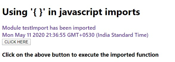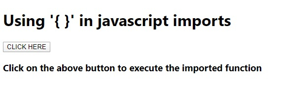 <!DOCTYPE html> <html lang="en"> <head> <meta charset="UTF-8" /> <meta name="viewport" content="width=device-width, initial-scale=1.0" /> <title>Document</title> <style> body { font-family: "Segoe UI", Tahoma, Geneva, Verdana, sans-serif; } .result { font-size: 18px; font-weight: 500; color: rebeccapurple; } </style> </head> <body> <h1>Using '{ }' in javascript imports</h1> <div class="result"></div> <button class="Btn">CLICK HERE</button> <h3>Click on the above button to execute the imported function</h3> <script src="script.js" type="module"> </script> </body> </html>