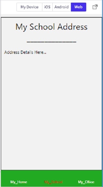 import{Component}from'react'; import{Text,View,StyleSheet}from'react-native'; import{NavigationContainer}from'@react-navigation/native'; import{createMaterialBottomTabNavigator}from'@react-navigation/material-bottom-tabs'; constBtmTbs=createMaterialBottomTabNavigator(); exportdefaultclassBottomBtmTbsExampleOneextendsComponent{ render(){ return( <NavigationContainer> <BtmTbs.Navigator initialRouteName="My_Home" activeColor="#c00" inactiveColor="#ffe" barStyle={{backgroundColor:'#2a2'}}> <BtmTbs.Screenname="My_Home"component={AddressHome}/> <BtmTbs.Screenname="My_School"component={AddressSchool}/> <BtmTbs.Screenname="My_Ofiice"component={AddressOffice}/> </BtmTbs.Navigator> </NavigationContainer> ); } } AddressHome=()=>( <Viewstyle={styles.Addresscontents}> <Textstyle={styles.AddressHeader}>MyHomeAddress</Text> <Textstyle={styles.AddressHeader}>______________</Text> <br/> <Textstyle={styles.AddressContent}>AddressDetailsHere...</Text> </View> ); AddressSchool=()=>( <Viewstyle={styles.Addresscontents}> <Textstyle={styles.AddressHeader}>MySchoolAddress</Text> <Textstyle={styles.AddressHeader}>______________</Text> <br/> <Textstyle={styles.AddressContent}>AddressDetailsHere...</Text> </View> ); AddressOffice=()=>( <Viewstyle={styles.Addresscontents}> <Textstyle={styles.AddressHeader}>MyOfficeAddress</Text> <Textstyle={styles.AddressHeader}>______________</Text> <br/> <Textstyle={styles.AddressContent}>AddressDetailsHere...</Text> </View> ); conststyles=StyleSheet.create({ Addresscontents:{ flex:1, width:'100%', padding:10, marginTop:10, borderWidth:1, borderColor:'black', }, AddressHeader:{ color:'black', fontSize:28, textAlign:'center', }, });