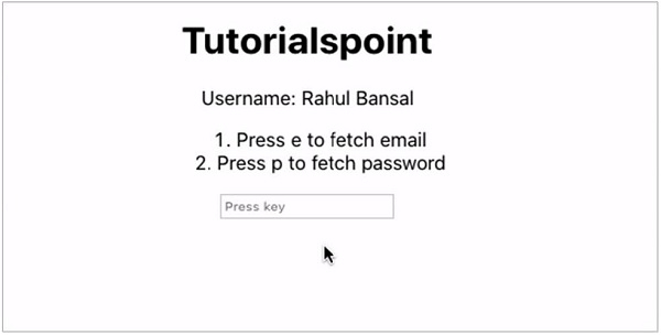 import React, { useState } from 'react'; const App = () => { const [email, setEmail] = useState(null); const [pass, setPass] = useState(null); const handler = (event) => { if (event.key === 'e') { setEmail('qwerty@gmail.com'); } else { setPass('qwerty'); } }; return ( <div> <h1>Tutorialspoint</h1> <p>Username: Rahul Bansal </p> <ol> <li>Press e to fetch email</li> <li>Press p to fetch password</li> </ol> {email ? <p>Email: {email}</p> : null} {pass ? <p>Password: {pass}</p> : null} <input placeholder="Press key" type="text" onKeyPress={(e) => handler(e)} /> </div> ); }; export default App;