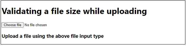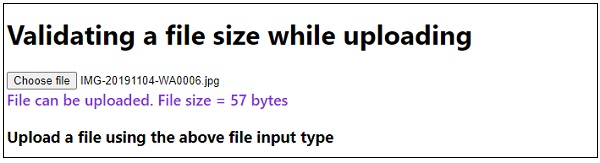 <!DOCTYPE html> <html lang="en"> <head> <meta charset="UTF-8" /> <meta name="viewport" content="width=device-width, initial-scale=1.0" /> <title>Document</title> <style> body { font-family: "Segoe UI", Tahoma, Geneva, Verdana, sans-serif; } .result { font-size: 18px; font-weight: 500; color: blueviolet; } </style> </head> <body> <h1>Validating a file size while uploading</h1> <input type="file" class="file" onchange="validateFile()" /> <div class="result"></div> <h3>Upload a file using the above file input type</h3> <script> let BtnEle = document.querySelector(".Btn"); let resEle = document.querySelector(".result"); let fileEle = document.querySelector(".file"); function validateFile() { if (fileEle.files.length) { let fileSize = Math.round(fileEle.files[0].size / 1024); if (fileSize > 4096) { resEle.innerHTML = "File cant be uploaded too big"; } else { resEle.innerHTML = "File can be uploaded. File size = " + fileSize+’ bytes’; } } } </script> </body> </html>