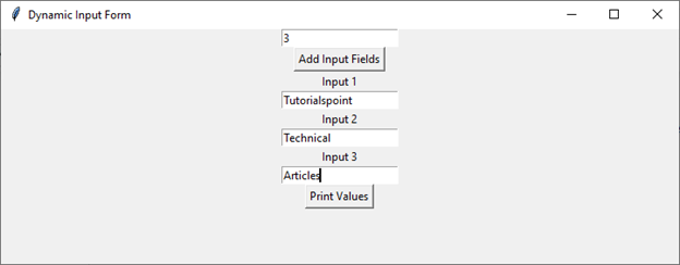 執行此指令碼後,將出現一個視窗,允許使用者輸入他們所需的欄位數量。單擊“新增輸入欄位”按鈕將在下方動態生成指定數量的輸入欄位。隨後,單擊“列印值”按鈕將檢索使用者輸入並在控制檯上列印它們。