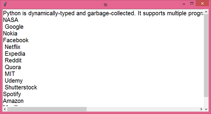 執行上面的程式碼將顯示一個視窗,其中包含有關 Python 程式語言的上下文。可以使用水平和垂直捲軸動態檢視上下文。