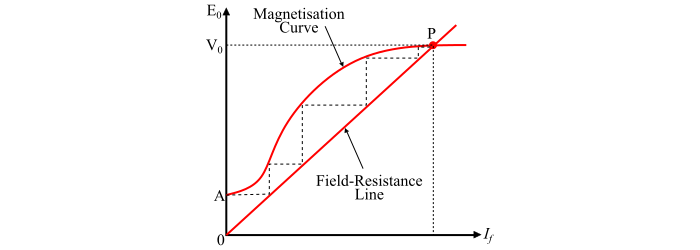 磁化曲線和勵磁電阻線的交點 (P) 給出了自激直流發電機的空載端電壓 V0。如果進一步增加對應於點 P 的勵磁電流,則端電壓不會進一步增加。