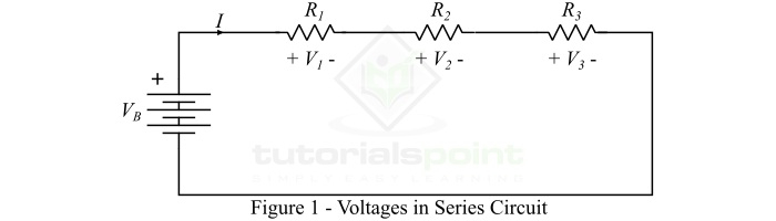 在串聯電路中,每個元件上的電壓不同,並且取決於元件的引數(例如,電阻器的電阻)。為了理解串聯電壓,請考慮圖 1 所示的電阻串聯電路。