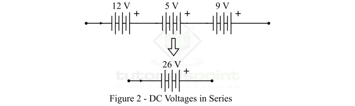 我們可以將多個直流電壓源串聯起來以獲得更高的直流電壓。直流電壓源的串聯連線如圖 2 所示。串聯組合的總電壓等於所有電壓源電壓之和。