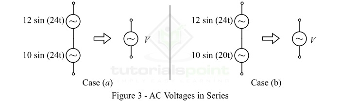 我們還可以將交流電壓源串聯起來以獲得更高的交流電壓。在將交流電壓源串聯時,務必記住所有交流電壓源的角頻率 (ω) 必須相同。此外,我們可以將多個具有不同頻率的交流電壓源串聯起來,但在這種情況下,流過所有電壓源的電流必須相同。