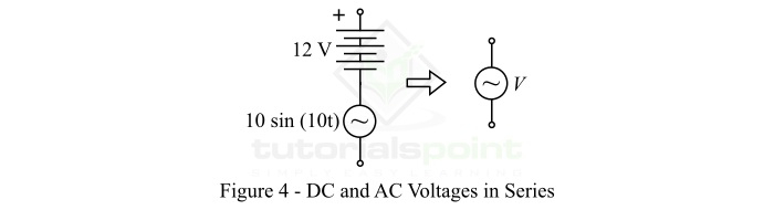 我們還可以將直流電壓源和交流電壓源串聯起來,前提是流過所有串聯電源的電流必須保持不變。圖 4 顯示了直流電壓源和交流電壓源串聯組合的一個示例。