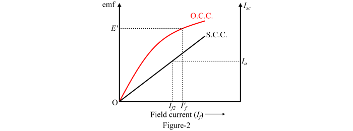 步驟 4 – 從圖 2 所示的空載特性曲線 (O.C.C.) 中,記下對應於電動勢 (E’) 的勵磁電流 (𝑰′𝒇)。然後,繪製勵磁電流 (𝑰′𝒇) 的相量,該相量超前電動勢 (E’) 90°。假設在短路條件下,所有勵磁都由電樞反應和電樞電抗的磁動勢所抵消。因此,