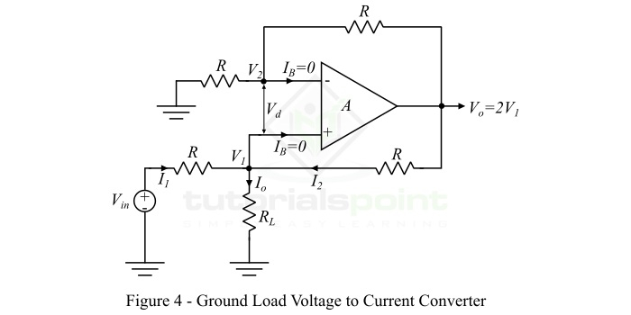 在**接地負載電壓電流轉換器**中,負載電阻 RL 的一端始終連線到地。接地負載電壓電流轉換器也稱為**霍蘭德電流轉換器**。這種電壓電流轉換器的電路圖如圖4所示。