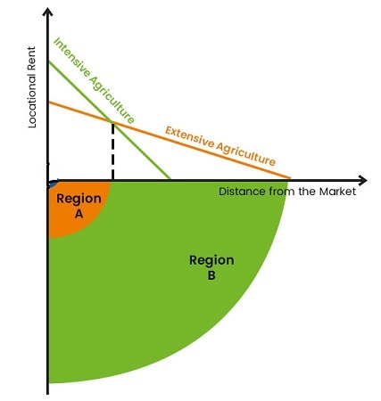 作物種植強度隨著距市場的距離增加而降低。這是因為靠近市場的農業用地的區位租金高於其他土地。由於假設市場價格是固定的,因此運輸成本是區位租金的唯一決定因素。隨著化肥、灌溉和勞動力等投入的增加,生產強度將提高。