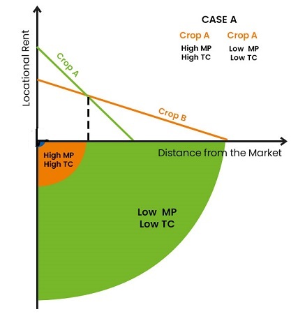 兩種作物 A 和 B 的生產成本和產量相同,但運輸成本和市場價格不同。假設 A 的市場價格較高且運輸成本較高。因此,作物 A 將種植在更靠近市場的地方。