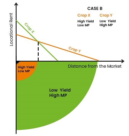 兩種作物 X 和 Y 的生產和運輸成本相同,但單位土地的產量和市場價格不同。假設 X 的產量較高,市場價格較低。因此,作物 X 將種植在更靠近市場的地方。