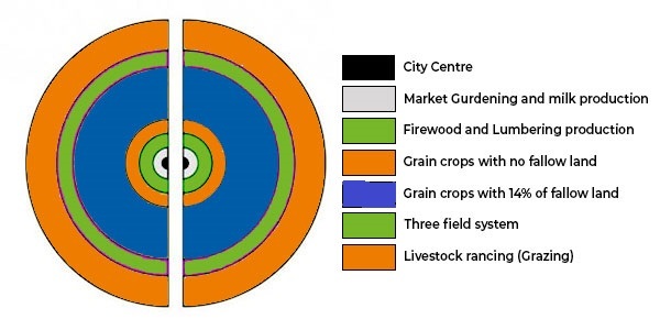 馮· Thünen 將市場周圍的區域劃分為六個同心環帶序列,如下所示。