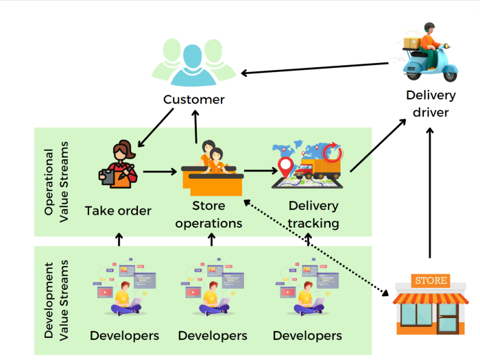 圖 1 展示了一家披薩公司的各種價值流。重要的是,公司首先確保運營價值流以客戶滿意度開始,並以向顧客交付正確產品結束。它包括接單、在商店運營和跟蹤送貨。在開發價值流中,我們有三個不同的開發團隊,負責部署訂單管理、在商店運營以及跟進送貨跟蹤系統。