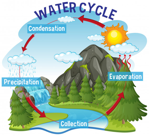 解釋: 在水迴圈中,海洋、河流、湖泊、池塘或溪流中的水蒸發,水蒸氣上升(蒸發)。