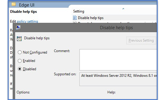 Edge UI 在視窗右側面板上顯示“停用幫助提示”,雙擊它將開啟“停用幫助提示”對話方塊。在“停用幫助提示”對話方塊中,有三個選項:停用、啟用和未配置。單擊“停用”,然後單擊“確定”。