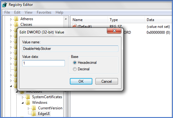 雙擊新的 D-WORD(32 位)值(DisableHelpSticker),在“數值資料”框中輸入“1”,然後單擊“確定”。