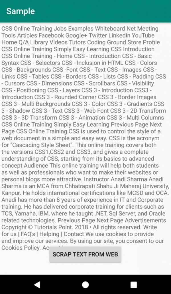 <?xml version="1.0" encoding="utf-8"?> <RelativeLayout xmlns:android="http://schemas.android.com/apk/res/android" xmlns:tools="http://schemas.android.com/tools" android:layout_width="match_parent" android:layout_height="match_parent" tools:context=".MainActivity"> <TextView android:id="@+id/textView" android:text="" android:layout_width="match_parent" android:layout_height="600dp" android:padding="4dp" android:layout_centerHorizontal="true" /> <Button android:id="@+id/btnView" android:text="Scrap Text from web" android:layout_width="wrap_content" android:layout_height="wrap_content" android:layout_centerHorizontal="true" android:layout_marginBottom="25sp" android:layout_alignParentBottom="true"/> </RelativeLayout>