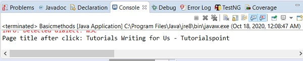 import org.openqa.selenium.WebDriver; import org.openqa.selenium.chrome.ChromeDriver; import org.openqa.selenium.WebElement; import org.openqa.selenium.By; public class DriverClick{ public static void main(String[] args) { System.setProperty("webdriver.chrome.driver", "C:\Users\ghs6kor\Desktop\Java\chromedriver.exe"); WebDriver driver = new ChromeDriver(); driver.get("https://tutorialspoint.tw/about/about_careers.htm"); // identify link with link text locator driver.findElement(By.linkText("Write for us")).click(); System.out.println("Page title after click: " + driver.getTitle()); } }
