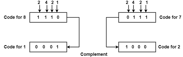 示例 - 2421碼和餘3碼是反射碼。在2421碼中:我們理解位置權重是2、4、2和1。下圖顯示了一個反射碼的示例,其中8的補碼是1,7的補碼是2。