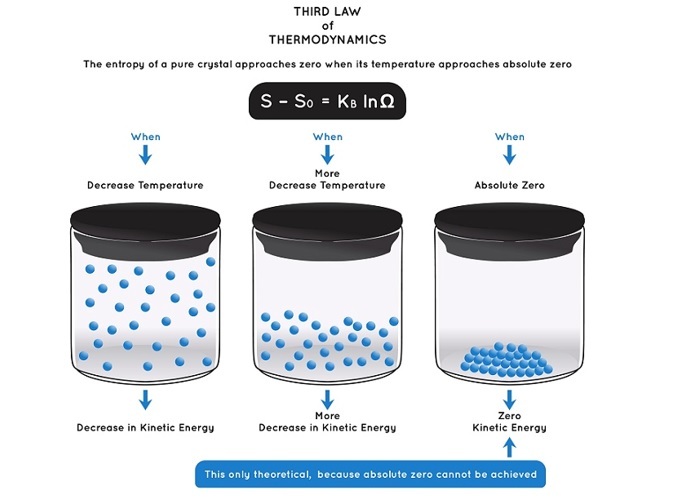 該定律指出,在絕對零度下,完美的晶體固體分子具有零熵,因為這是物質可以具有的最有序狀態。熵以焦耳每開爾文為單位測量,它不是能量的量度,而是系統內能量的分佈。