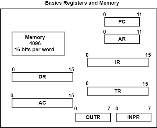 - 輸入暫存器 (INPR) 和輸出暫存器 (OUTPR) 用於 I/O 操作。INPR 從輸入裝置接收 8 位字元。OUTPR 類似。