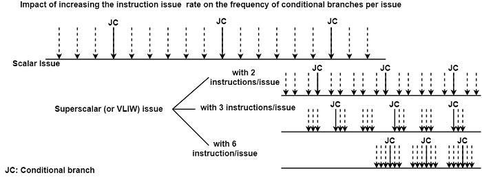為了實現這一點,處理器必須整合越來越多的執行單元(EU),並被迫提高指令發出率。但是,每個週期發出的指令越多,在每個週期遇到條件控制依賴的機率就越高。