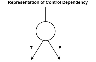 就像資料依賴關係一樣,控制依賴關係也可以用有向圖來定義。轉移控制依賴關係的指令通常由具有兩個後繼弧的節點定義,如圖所示。輸出弧定義真(T)和假(F)路徑,並通常相應地標記。