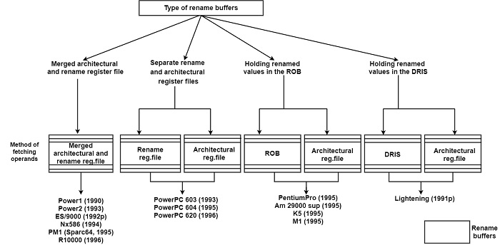 有四種不同的方法可以實現重新命名緩衝區,例如使用合併的體系結構和重新命名暫存器檔案,使用單獨的名稱暫存器檔案,或者將重新命名的值儲存在 ROB 或 DRIS 中。