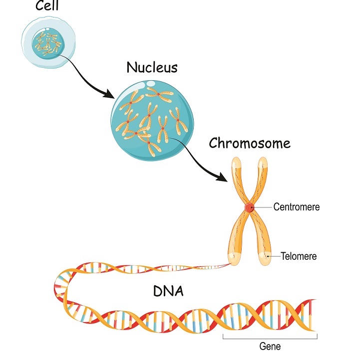 基因由DNA組成,並組織成染色體,染色體存在於細胞的細胞核中。每條染色體包含許多基因,這些基因以特定的順序排列。基因中核苷酸的序列決定了其編碼的蛋白質中氨基酸的序列。基因的表達受到各種因素的調控,例如DNA甲基化和組蛋白修飾。