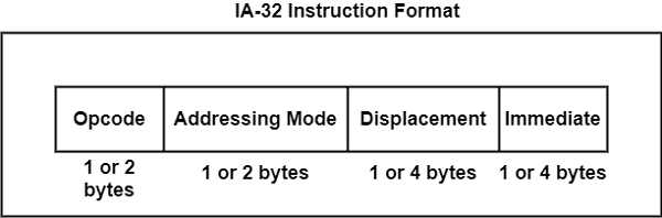 圖中顯示了通用的 IA-32(英特爾架構 - 32 位)指令格式。IA-32 是英特爾最優秀的微處理器可以使用的指令格式。此指令格式包含四個欄位,例如操作碼欄位、定址方式欄位、位移欄位和立即數字段。
