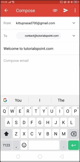 }在上面,當用戶單擊按鈕時,它將使用ACTION_SEND呼叫Intent,並將型別設定為message/rfc882。現在我們傳遞了電子郵件ID和主題訊息。