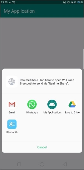 單擊上面的按鈕,它將呼叫Intent選擇器以選擇應用程式來發送來自Intent的資料,如下所示 -