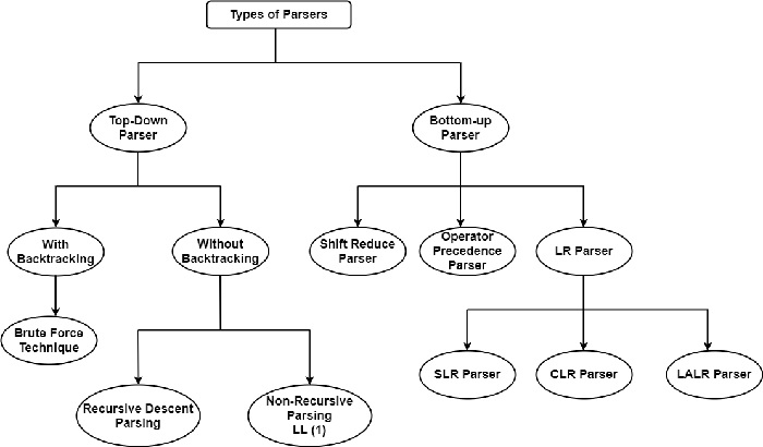 解析被稱為語法分析。它包含將標記作為原始碼排列成語法階段,編譯器使用這些階段來合成輸出,通常原始碼的語法階段由語法樹定義。有各種型別的解析技術,如下所示: