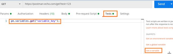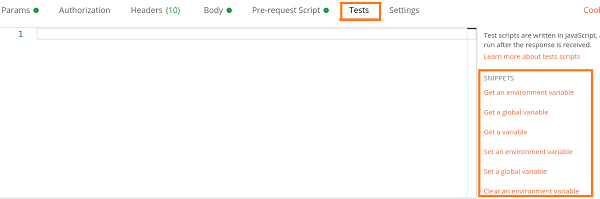 片段可以在 Postman 的“請求前指令碼”和“測試”選項卡中使用。導航到“測試”選項卡,“片段”部分應該出現在螢幕最右側。單擊任何片段以在指令碼中使用它。