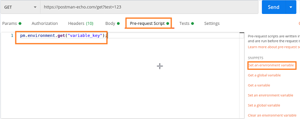 單擊“獲取環境變數”連結後,以下指令碼會填充到“請求前指令碼”選項卡中,可用於我們自己的指令碼 -