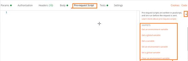 導航到“請求前指令碼”選項卡,“片段”部分應該出現在螢幕最右側。單擊任何片段以在指令碼中使用它。