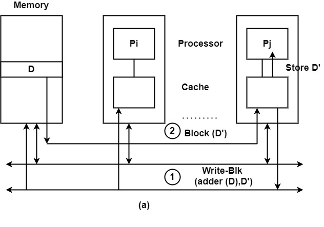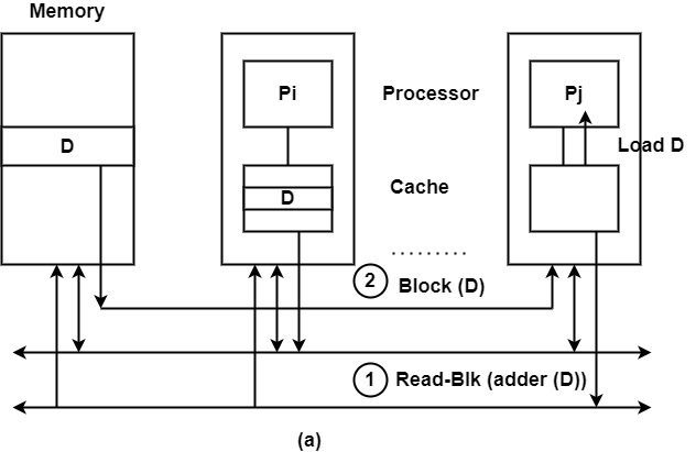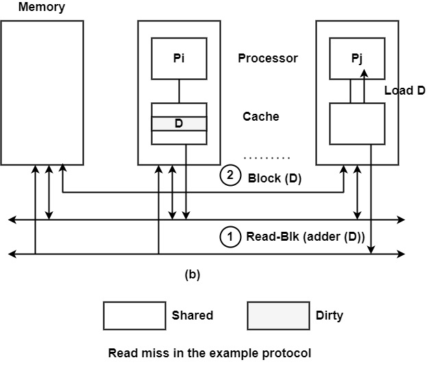 如果存在髒副本,則它提供必要的副本並更新主記憶體。所有副本都變為共享。此機制如圖(b)所示。
