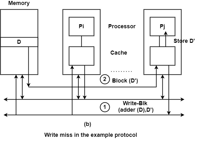 **寫未命中** - 窺探快取控制器在總線上廣播Write-blk命令。Write-blk命令包含更新資料的地址和值。