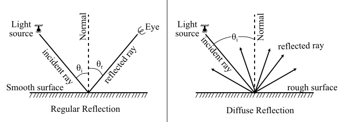 當光線照射到粗糙表面(如木材或牆壁等)時,就會發生漫反射。在漫反射中,反射光向各個方向散射,觀察者看到的是被照亮的表面,而不是光源。