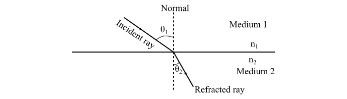 $$\mathrm{\mathit{n_{\mathrm{1}}}\:\mathrm{sin}\:\theta _{\mathrm{1}}\:=\:\mathit{n_{\mathrm{2}}}\:\mathrm{sin}\:\theta _{\mathrm{2}}}$$