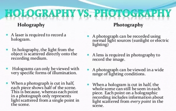 維度的差異:照相是對三維物體的二維檢視,而在全息照相中,觀察者可以看到原始物體的完整三維影像。
