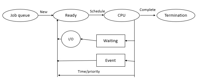 作業佇列 - 用於儲存系統中的所有程序。它包含駐留在海量儲存/輔助儲存器上並等待主記憶體分配的程序列表。當程序駐留在作業佇列中時,程序的狀態為新建狀態。