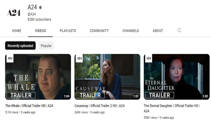 名為“電影”的YouTube影片類別包含所有與電影相關的內容。例如電影評論、電影預告片和電影片段。由A24、迪士尼和索尼等主要電影和動畫工作室製作的電影預告片通常在YouTube上擁有最多的觀看次數。