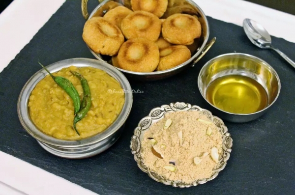 這是一道非常著名的拉賈斯坦邦菜餚,在該地區非常普遍。巴蒂基本上是一種硬麵包,在拉賈斯坦邦附近的地區烹飪。巴蒂或麵包總是與達爾(也稱為扁豆咖哩)一起食用。巴蒂在拉賈斯坦邦地區很有名,因為它在製作過程中幾乎不需要水,而且保質期很長,可以儲存而不易變質。另一方面,丘爾瑪是一種用酥油和糖烹製的研磨小麥混合物。
