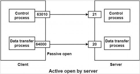 - 伺服器在眾所周知的埠 21 上發出一個正向開啟,並等待客戶端。