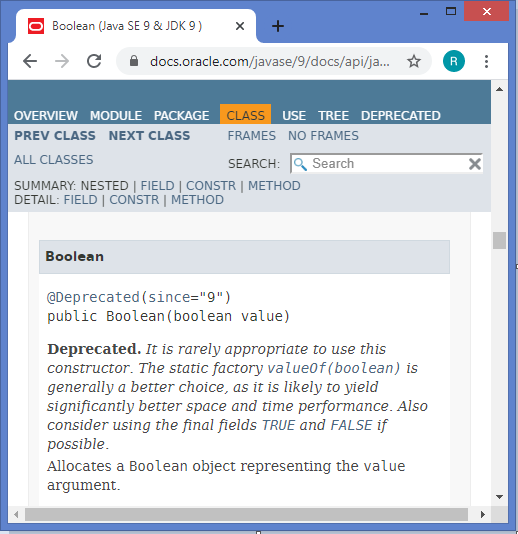 以下網頁是 **Java 9** 中 **Boolean** 類的文件。文件中的 **@Deprecated 註解** 使用了 "**since**" 屬性:**Boolean** 類。
