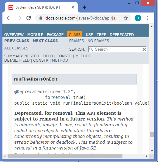 以下網頁是 **Java 9** 中 **System** 類的描述。文件中的 **@Deprecated 註解** 使用了 "**forRemoval**" 屬性:**System** 類。