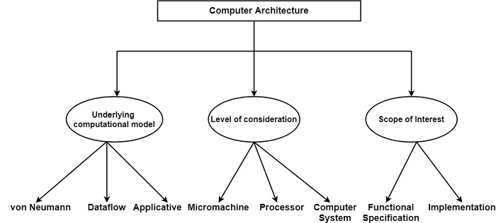 它可以從多個抽象層次來解釋計算機體系結構理論。在每個層次上,體系結構都將透過宣告底層計算模型、功能規範和實際實現來表示。因此,解釋涵蓋了三個要素,包括底層計算模型、考慮的層次和關注的範圍,如圖所示。